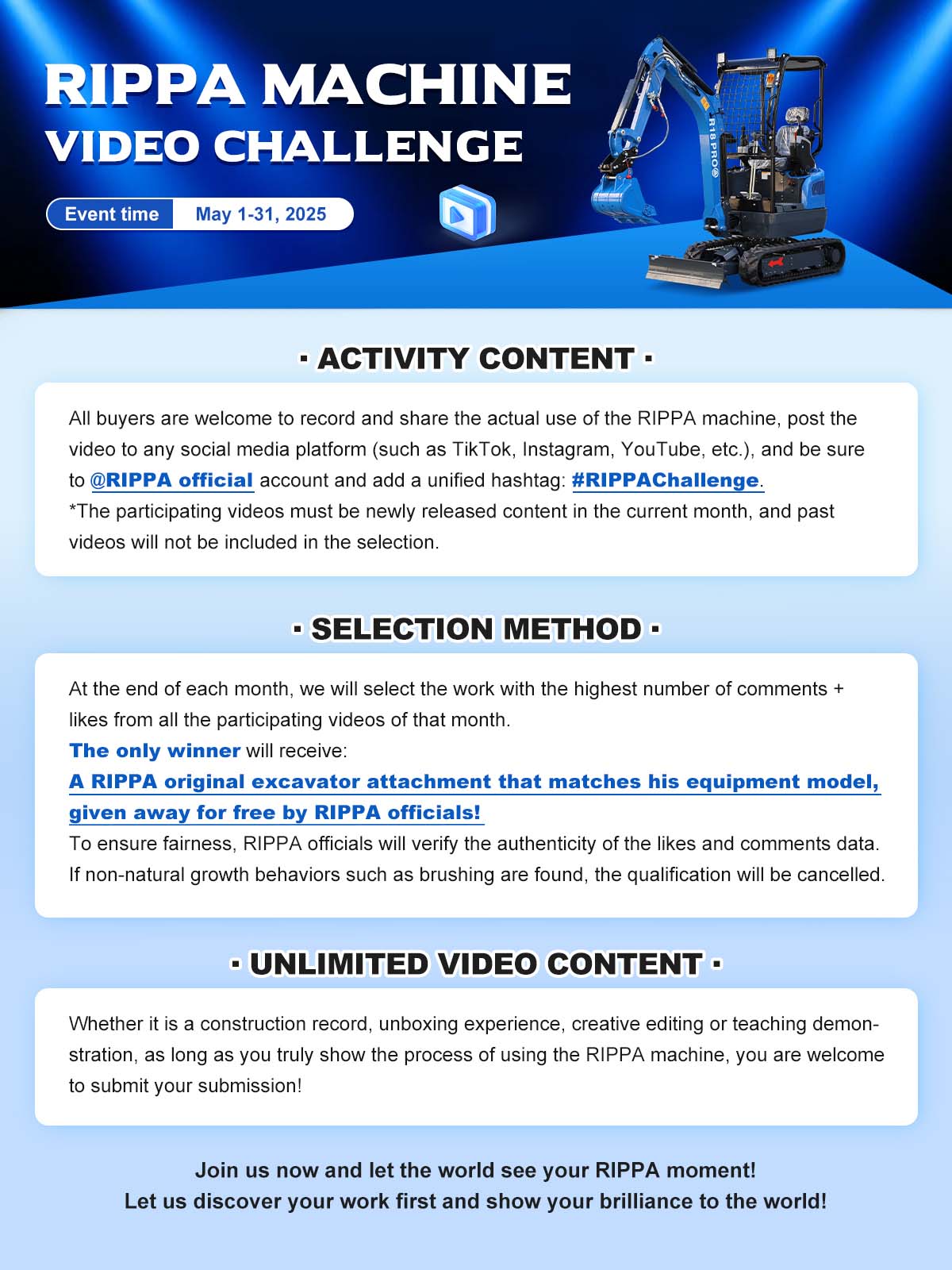 At the end of each month, we will select the video with the highest interaction as the winner based on the number of likes and comments received by the participating works. The only winner will win a “RIPPA original excavator attachment that matches its equipment model” given away by RIPPA officials for free. In order to ensure fair selection, RIPPA officials will verify the authenticity of likes and comments. If you find any likes or abnormal behavior, your qualification will be cancelled.