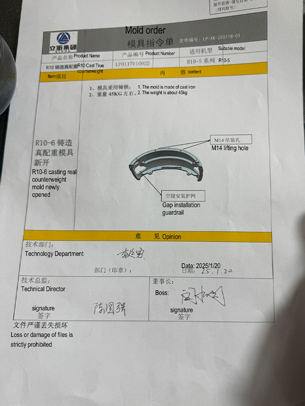 Em 20 de janeiro de 2025, o departamento técnico do Grupo RIPPA aprovou oficialmente o projeto e o plano de abertura do molde do contrapeso real de fundição R10-6 e concluiu a primeira verificação da produção do molde. O desenvolvimento e a produção desse molde marcam um passo importante para o Grupo RIPPA na melhoria da precisão da fabricação e do desempenho dos contrapesos de escavadeiras pequenas.
