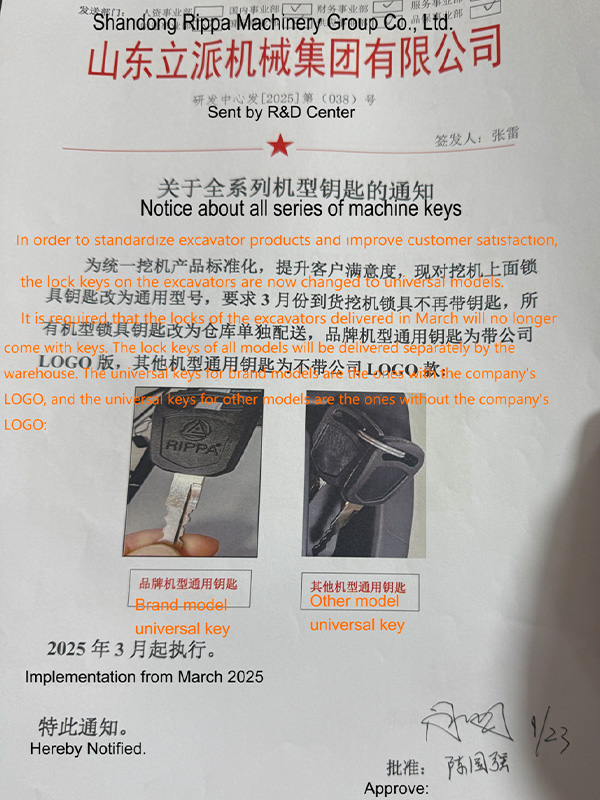 De acordo com o conteúdo do aviso, as escavadeiras RIPPA entregues a partir de março de 2025 não usarão mais a versão antiga da chave, mas usarão dois novos tipos de chaves universais: uma é uma chave universal para modelos da marca com o LOGOTIPO da marca RIPPA; a outra é uma chave universal para outros modelos sem o LOGOTIPO. As duas chaves serão distribuídas uniformemente pelo depósito da empresa para garantir a padronização e a consistência do processo de entrega.