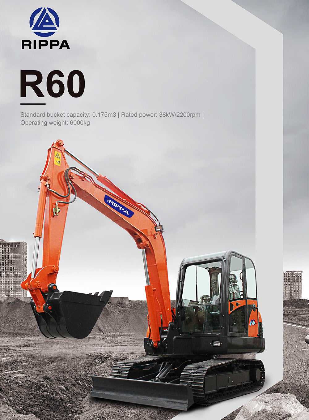 Rippa is a 6 ton excavator.Rippa R60 Large Excavator Equipped with Yanmar 4TNV94L engines, providing more power support for driving. With a gentle roar, elegant start strong and stable output power, it has been proven by the market .