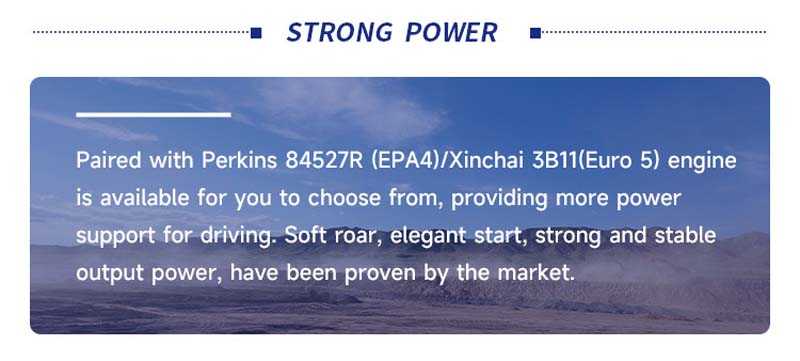 Equipped with Perkins 84527R (EPA4) or Xinchai 3B11 (Euro 5) engines, providing strong power support.