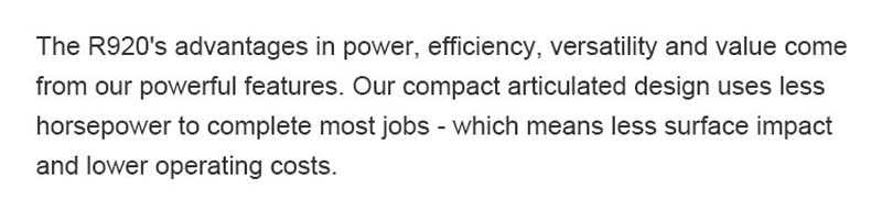 The R920 loader adopts an efficient design to complete most of the work with lower horsepower, reduce surface impact, reduce operating costs and improve productivity.