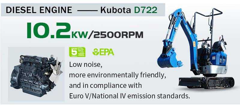 Equipped with a high-torque, low-vibration Kubota 3-cylinder engine, it meets Euro 5 and EPA 4 emission standards, provides strong excavation power and low noise.