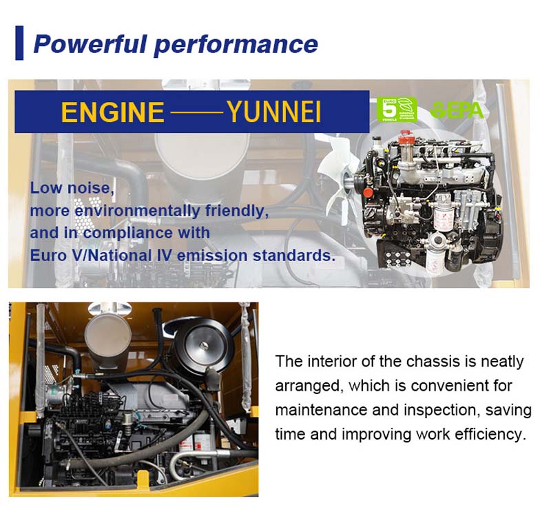 RL20 wheel loader is equipped with Yunnei YN36GBZ engine, which can meet Euro V emission standards and achieve a balance between strong power and environmental performance.