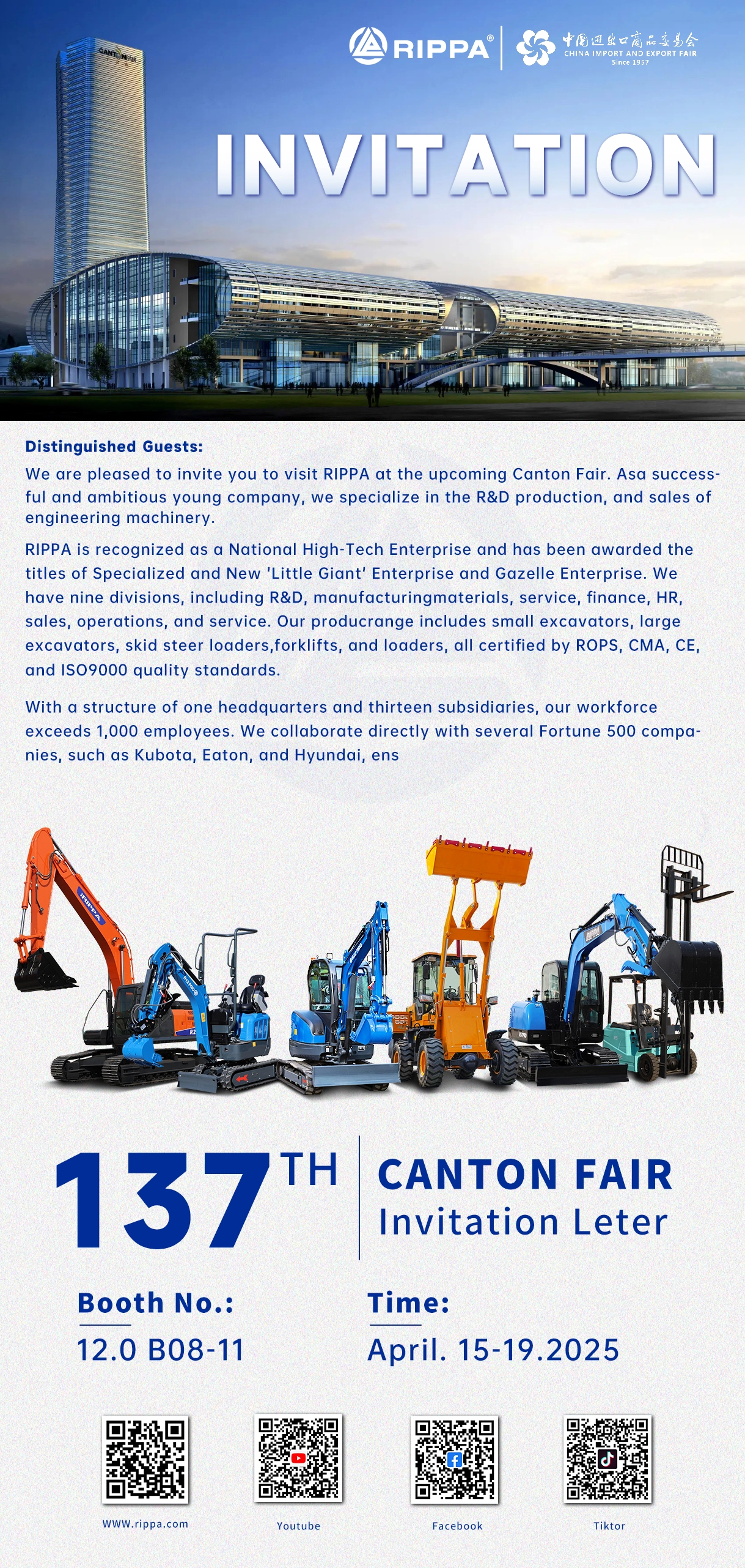 We are pleased to extend a warm invitation to industry professionals to visit RIPPA at the upcoming 137th Canton Fair. As a leading high-tech enterprise focusing on the R&D and production of construction machinery, RIPPA is ready to showcase our latest innovations.