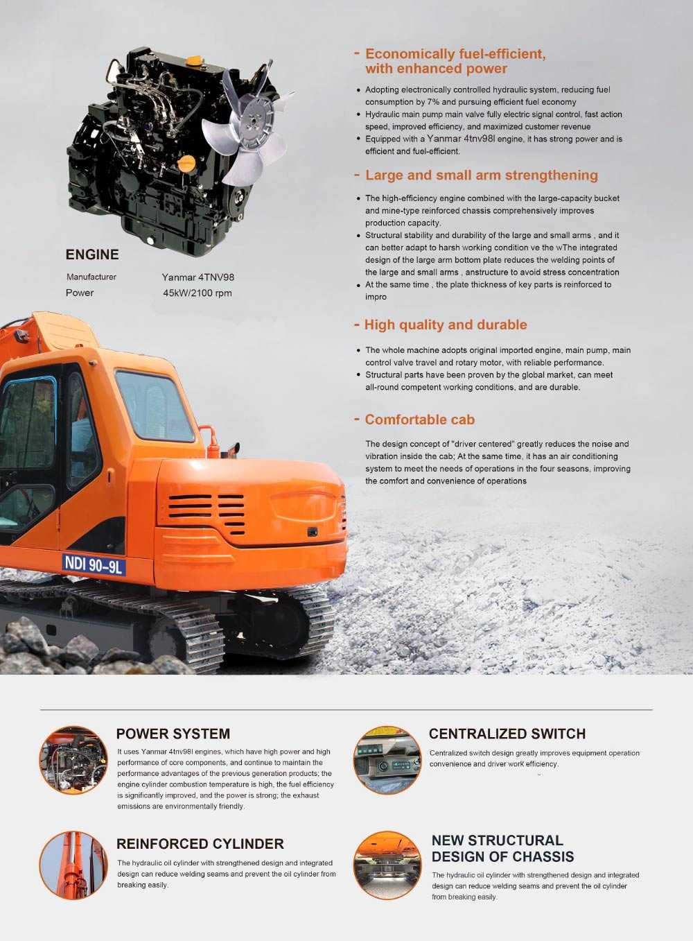 The NDI90 excavator is an 8-ton excavator powered by a Yanmar engine with strong performance. NDI90 excavator is mainly used for road repair, land leveling, ground filling, pipeline laying, mining, construction of reservoirs and river and ditch dredging projects, construction projects, etc. operating environment. The NDI90 excavator has multiple functions such as excavation, crushing, trench clearing, drilling, and bulldozing.