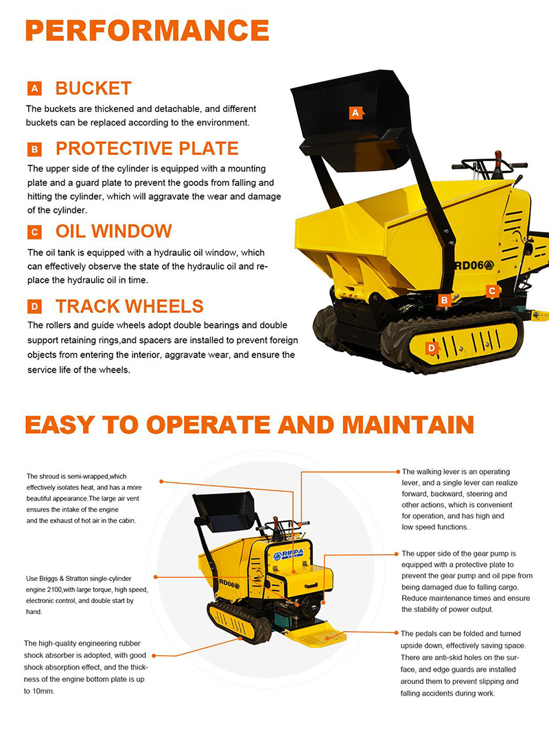 Rippa RD06 dump truck is a multi-purpose engineering machine with excellent performance, designed to meet the efficient work needs of industries such as construction, agriculture and mining. The equipment is an ideal choice for small engineering scenes with its excellent load capacity and simple operation. It is equipped with a detachable thickened bucket, hydraulic observation window, double protection system and efficient crawler design, which can provide stable and reliable support under various working conditions.