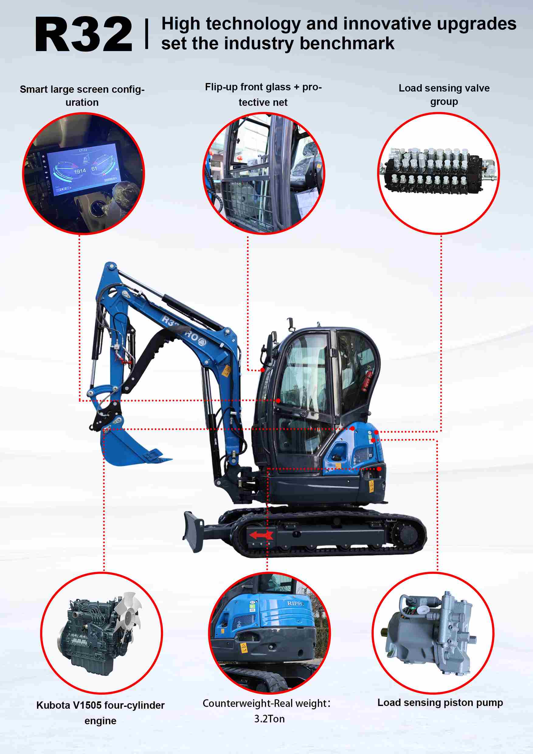 – Smart Technology: Featuring a large-screen configuration and a flip-up front glass for convenience, the R32 integrates smart technology to enhance operator interaction while ensuring top performance with its Kubota V1505 engine.