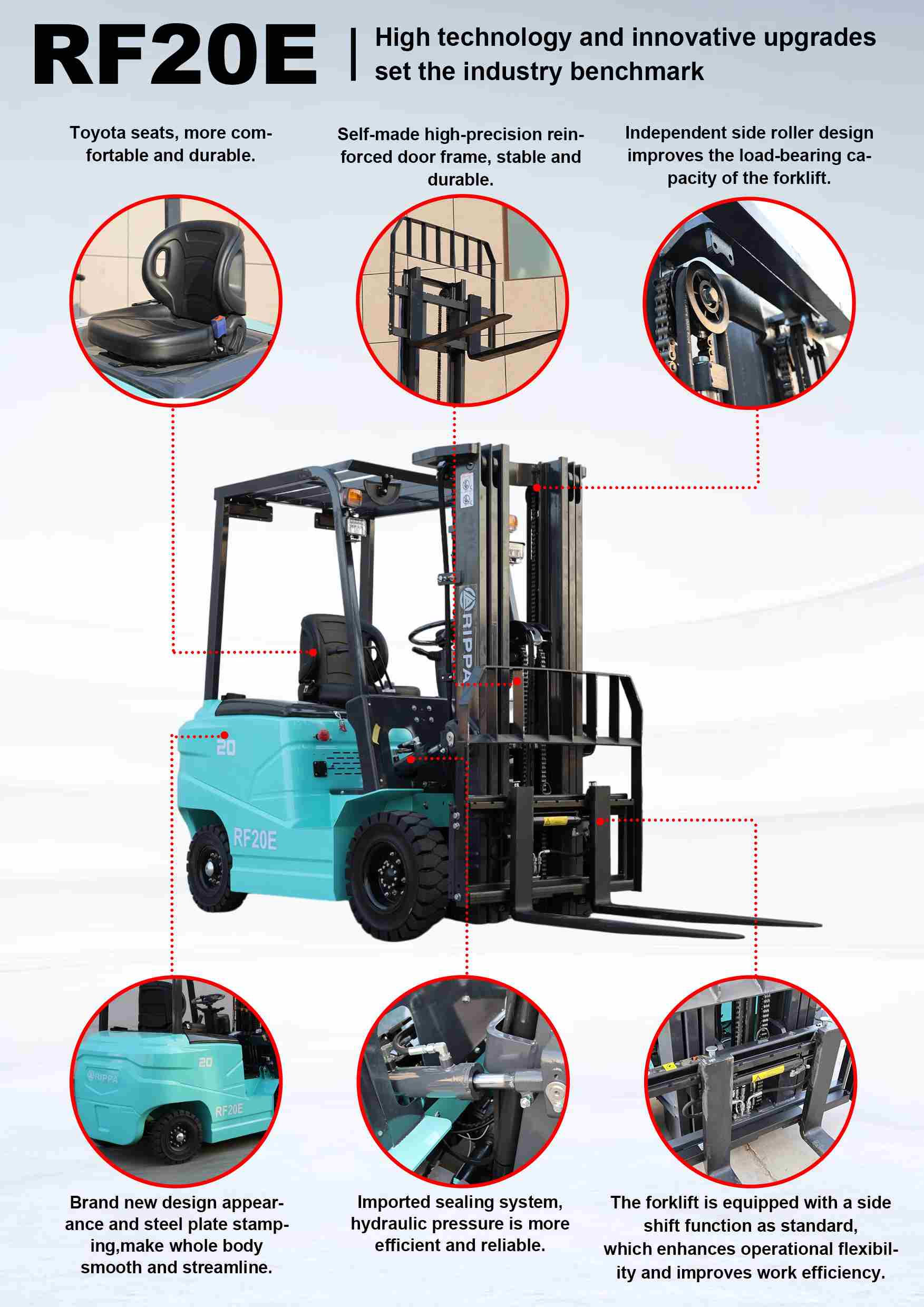 – Robust and Efficient Design: These forklifts incorporate a self-made high-precision reinforced doorframe and upgraded hydraulic systems, ensuring stability, efficiency, and a comfortable driving experience.