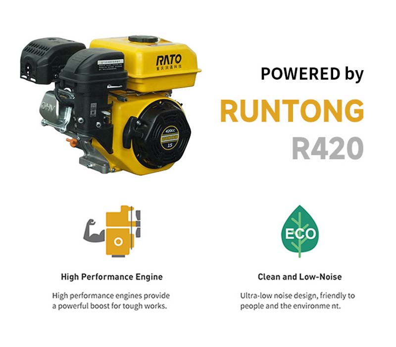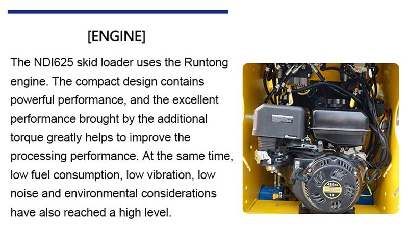 The RS03 skid loader is equipped with a **Runtong R420 engine, which provides powerful power and achieves efficient and energy-saving operation: