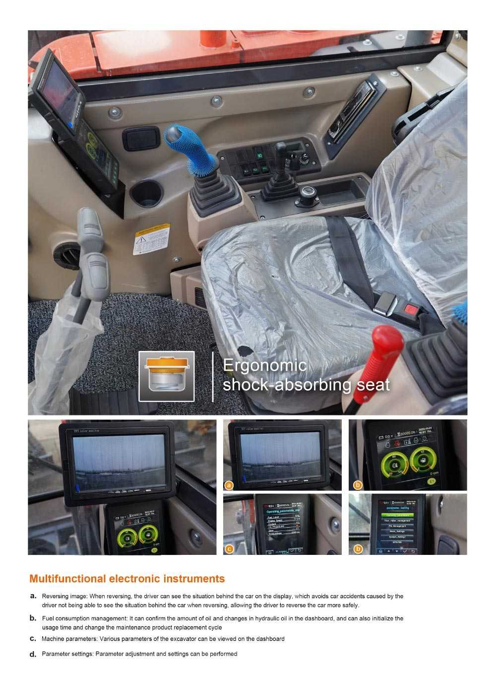 Steel track/air conditioning/adjustable driving seat/standard bucket/hydraulic lock/cab/escape hammer/portable fire extinguisher/audio