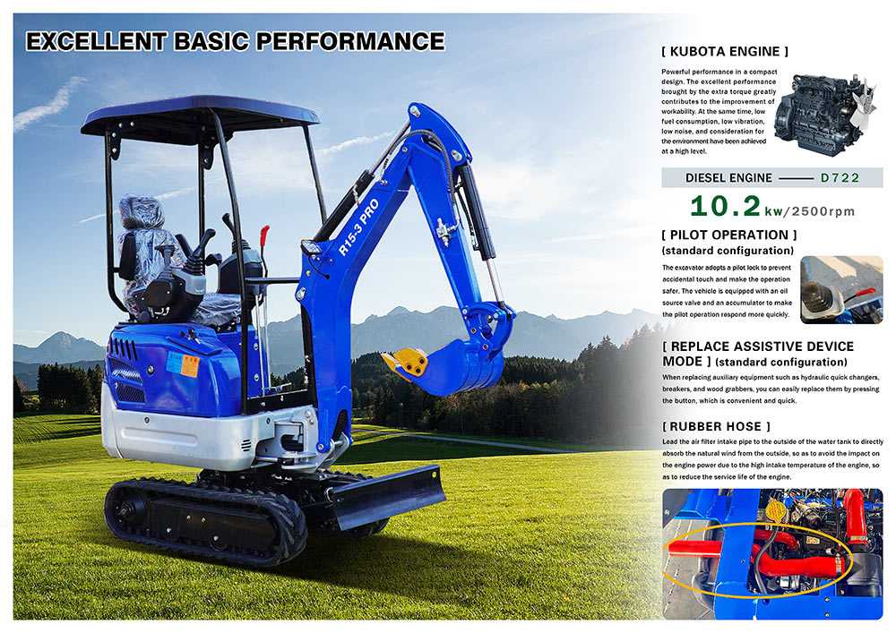 The R15ECO small excavator uses a powerful, economical and labor-saving Kubota engine, with exquisite production technology and a seat that is more in line with human body posture, allowing you to work easily and enjoy a better life.Stamped protective cover, round and smooth appearance. The unique design of the four-legged ceiling is streamlined, which looks more beautiful and durable.