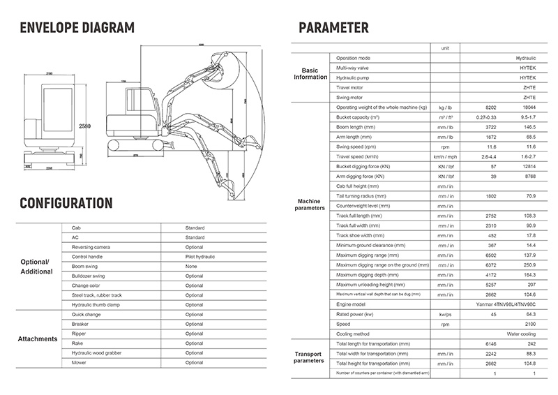 If you are looking for a medium-sized excavator that combines high-efficiency power, environmental protection, energy saving and easy maintenance, the Rippa 8 Ton Excavator is definitely worth paying attention to. Equipped with the advanced Yanmar 4TNV98L/4TNV98C engine with a maximum power of 45KW (64.3ps), it not only has powerful digging force, but also ensures excellent fuel economy and comfortable control experience.