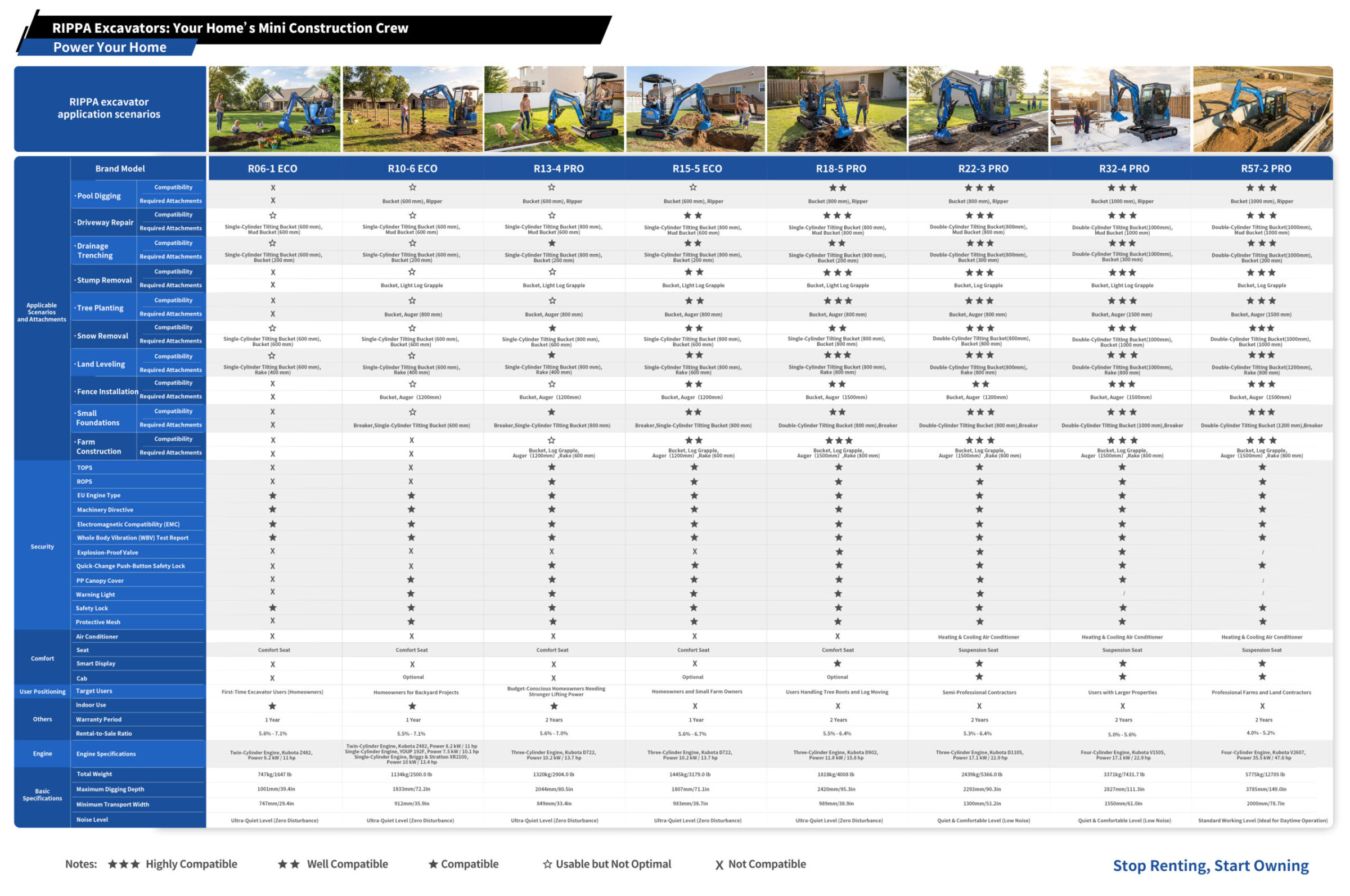 Compare RIPPA mini excavator models including R06-1 ECO, R10-6 ECO, R13-4 PRO, R15-5 ECO, R18-5 PRO, R22-3 PRO, R32-4 PRO, and R57-2 PRO. Learn how to choose the right machine based on job type, attachments, work space, and long-term value.