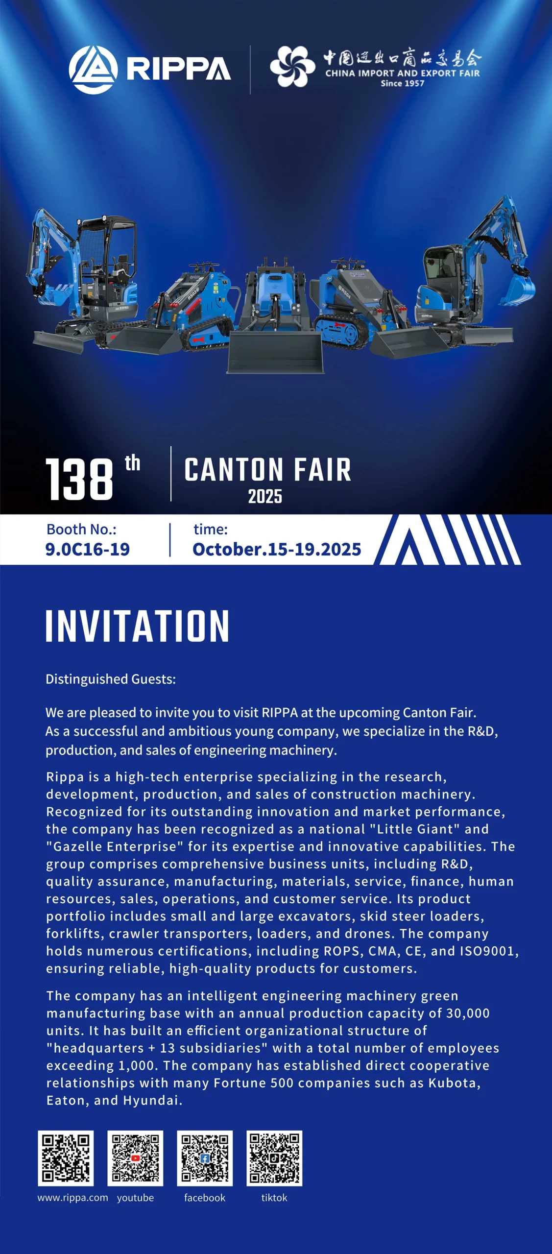 At the Canton Fair 2025, RIPPA will showcase its latest blue-series mini excavators and skid steer loaders, representing the next generation of compact, intelligent machinery made in China. Visitors are invited to experience firsthand the brand’s innovation, reliability, and international service support.