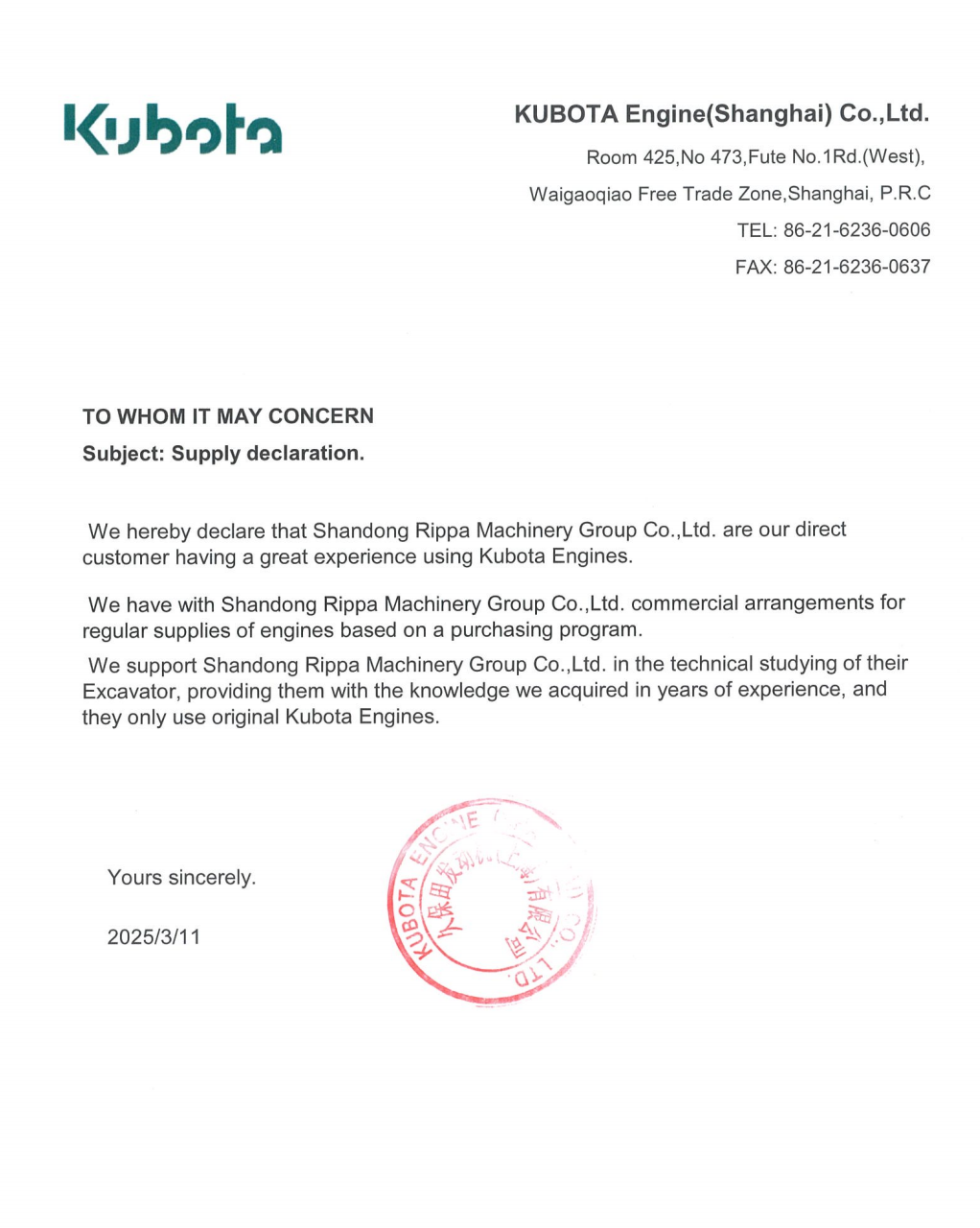 In the global small construction machinery market, RIPPA (Shandong Lipai Machinery Group Co., Ltd.) has become one of the industry’s leading brands with its excellent manufacturing process and innovative technology. Recently, RIPPA’s cooperation with Kubota engines has been further officially certified. Kubota Engine (Shanghai) Co., Ltd. officially issued a supply statement, confirming that RIPPA is its direct customer and has long purchased original Kubota engines for excavator products.