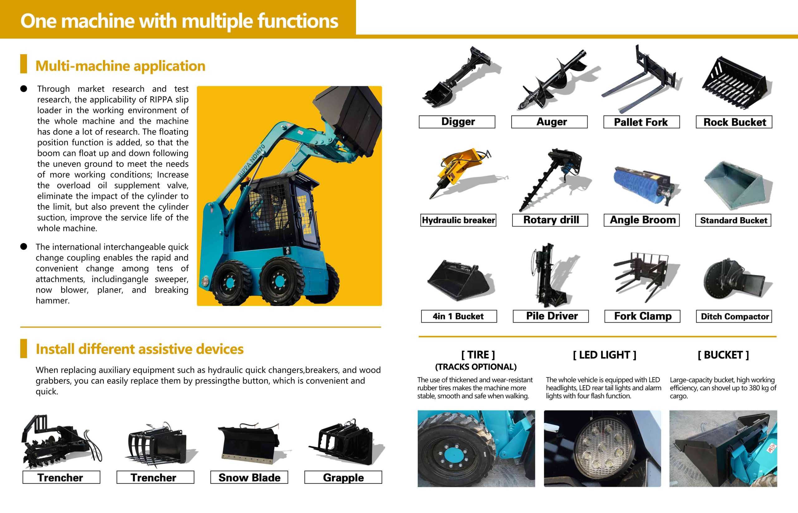 RIPPANDI670,ND1670 is a brand new heavy-duty skid steer loader launched byRIPPA.,The whole machine adoptsa high-power engine,which increases the flow,rate of thewholemachine andmeets therequirements ofmore machines:,The wheelbase of thewholemachine isincreased to ensure thestability,andsafetyunderhigh load.Itismainlyused inthedomesticsnowremoval,market andmunicipal maintenance and other heavy-duty operating,conditions.