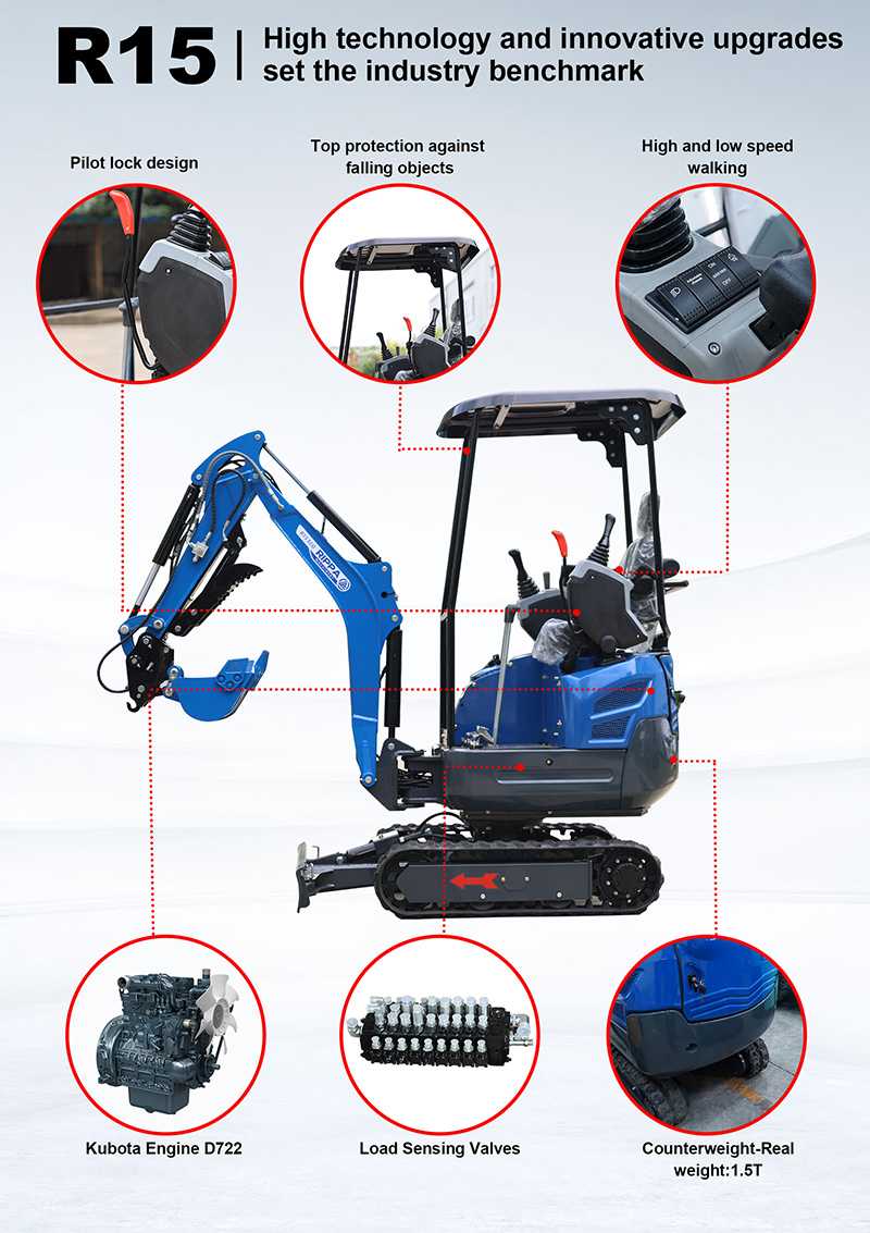 Through these functional highlights, the R15 mini excavator excels in safety, power performance and operational flexibility, making it an ideal choice for small construction projects. These innovative designs make it stand out in the fiercely competitive market and become a leader in the industry.