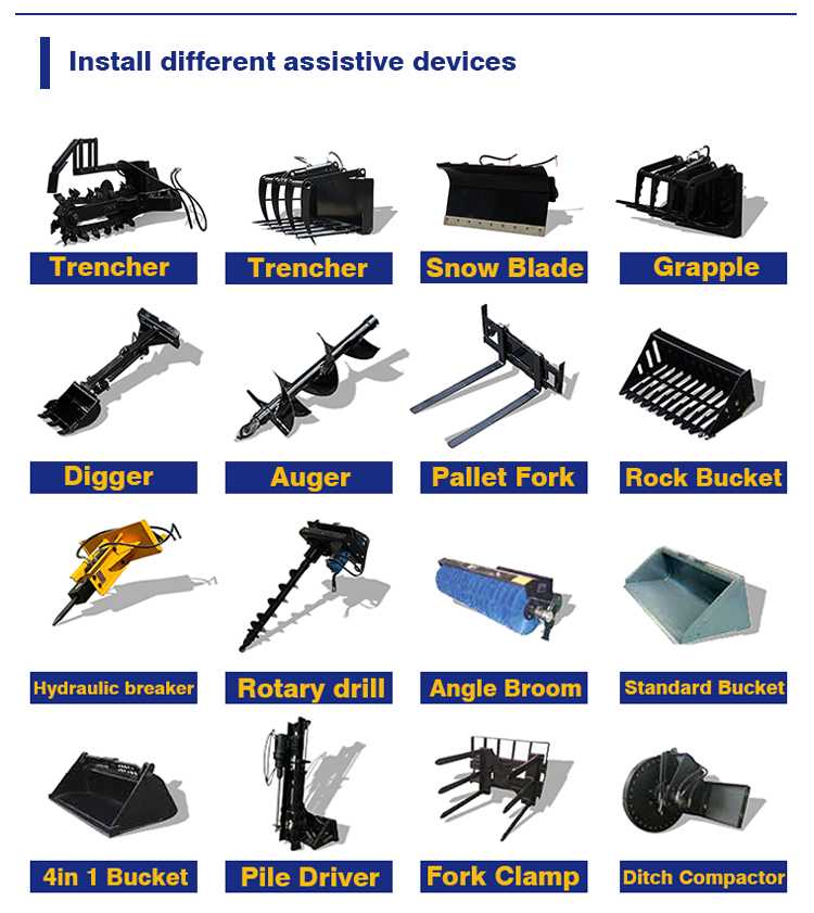 3. High efficiency: The power system of a skid steer loader is usually very powerful and can complete large-scale earthwork, handling and cleaning tasks in a relatively short time.