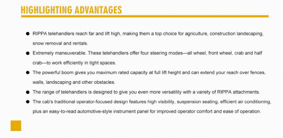The RH35 Telehandler is a high-performance, multi-application construction machinery manufactured by RIPPA. With its excellent lifting capacity, flexible control performance and reliable design, it meets various operational needs such as agriculture, construction, and rental. Whether it is heavy load handling, snow clearing, or aerial work, the RH35 can handle it with ease.