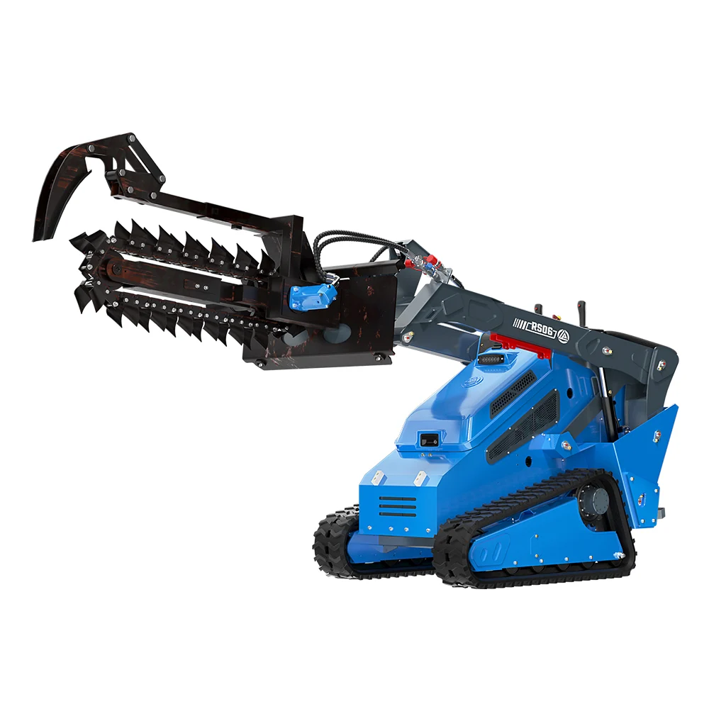 Den trencher attachment on the RS06 transforms this compact loader into a high-efficiency trenching machine. With its durable chain design and strong cutting teeth, the trencher can dig through various soil conditions — from soft earth to compacted clay.