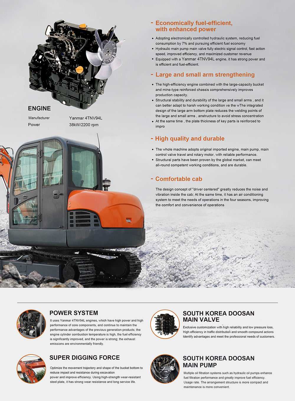 Adopting electronically controlled hydraulic system, reducing fuel consumption by 7% and pursuing efficient fuel economy Hydraulic main pump main valve fully electric signal control, fast action speed, improved efficiency, and maximized customer revenue Equipped with a Yanmar 4TNV94L engine, it has strong power and is effcient and fuel-effcient.